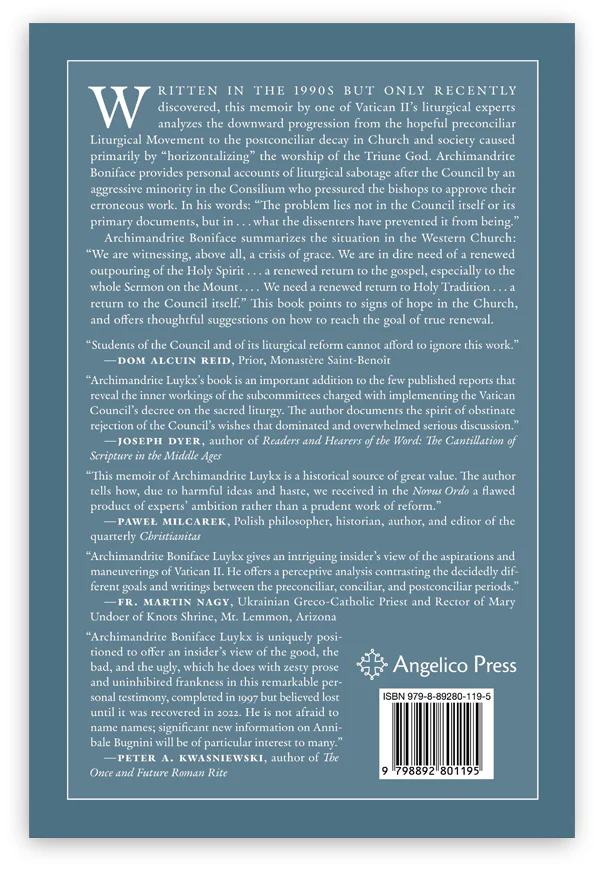 Cette évaluation est confortée par l’avis de l’archimandrite Boniface Luykx, théologien liturgique, peritus (consultant, expert) du Concile Vatican II et membre de la commission liturgique vaticane (appelé Consilium) présidée par le père Annibale Bugnini. Luykx a mis en évidence les fondements théologiques erronés qui sous-tendaient les travaux de cette commission, écrivant : « Derrière ces exagérations révolutionnaires se cachaient trois principes typiquement occidentaux, mais faux : (1) l’idée (à la Bugnini) de la supériorité et de la valeur normative de l’homme occidental moderne et de sa culture pour toutes les autres cultures ; (2) la loi inévitable et tyrannique du changement constant que certains théologiens appliquaient à la liturgie, à l’enseignement de l’Église, à l’exégèse et à la théologie ; et (3) la primauté de l’horizontalité » (A Wider View of Vatican II, Angelico Press, 2025, p. 131).